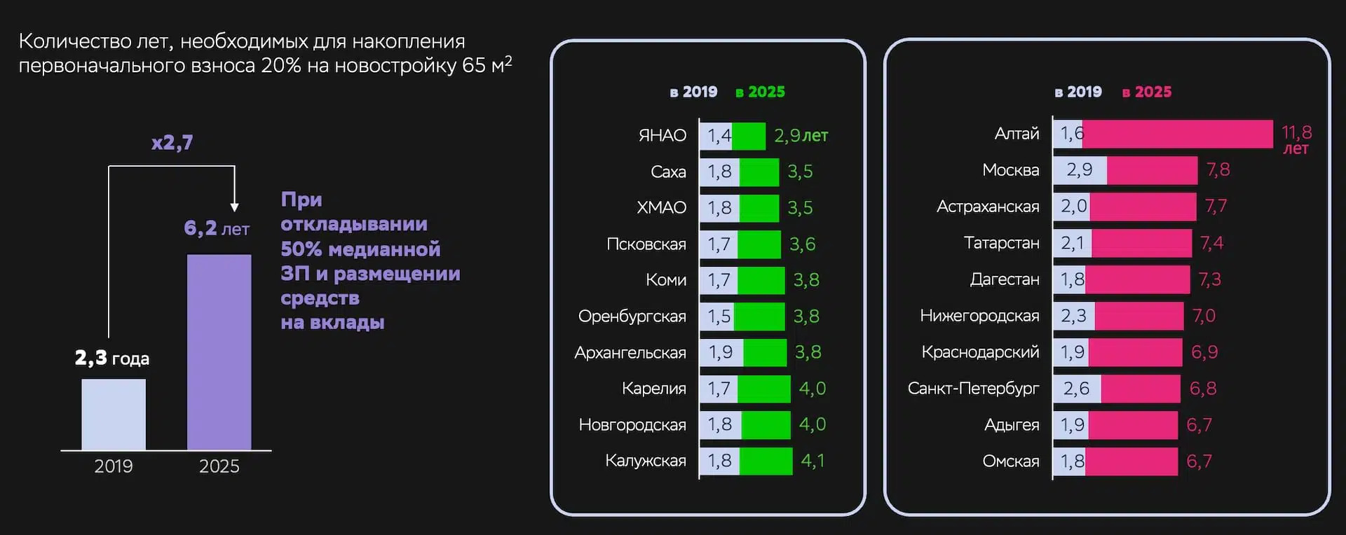 Дольше всего на первоначальный взнос понадобится копить в Республике Алтай (11,8 года), Москве (7,8 года), Астраханской области (7,7 года), Республике Татарстан (7,4 года), Республике Дагестан (7,3 года), Нижегородской области (7 лет), Краснодарском крае (6,9 года), Санкт-Петербурге (6,8 года), Республике Адыгея и Омской области (по 6,7 года).