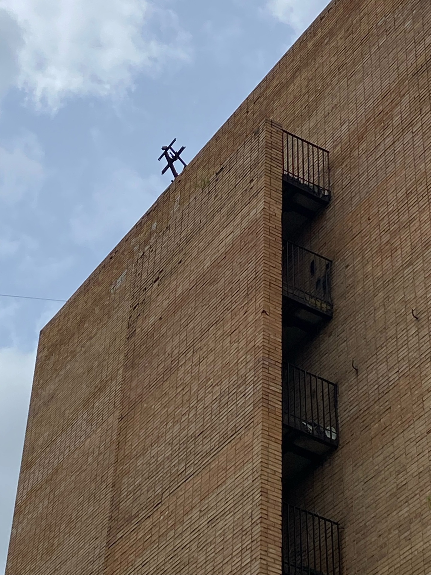 «На крыше осталась ещё похожая железяка. Наверно скоро также упадет! Ранее там же лежала железная «тарелка» диаметром несколько метров и весом (на вскидку) больше 100 кг. Скорее всего это всё одна и та же конструкция»,