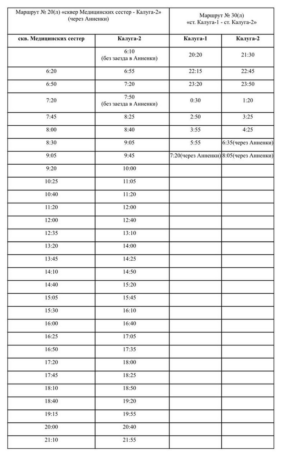 С 4 октября будет изменено расписание маршрутов № 20 (Сквер Медицинских сестер - Калуга-Сергиев Скит) и № 30 (Калуга I - Калуга-Сергиев Скит). Как сообщили в городской администрации Калуги, изменения в расписание внесены по многочисленным просьбам калужан.