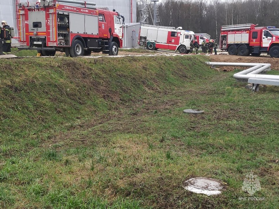 На калужском предприятии хранения нефтепродуктов МЧС провело пожарно-тактические учения, по легенде которых предприятие загорелось в результате атаки беспилотников.