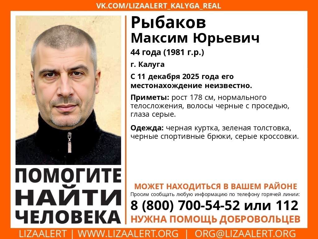 Приметы пропавшего: рост 178 сантиметров, нормального телосложения, черные волосы с проседью и серые глаза. В день исчезновения Максим Рыбаков был в черной куртке, зеленой толстовке, черных спортивных брюках и серых кроссовках.
