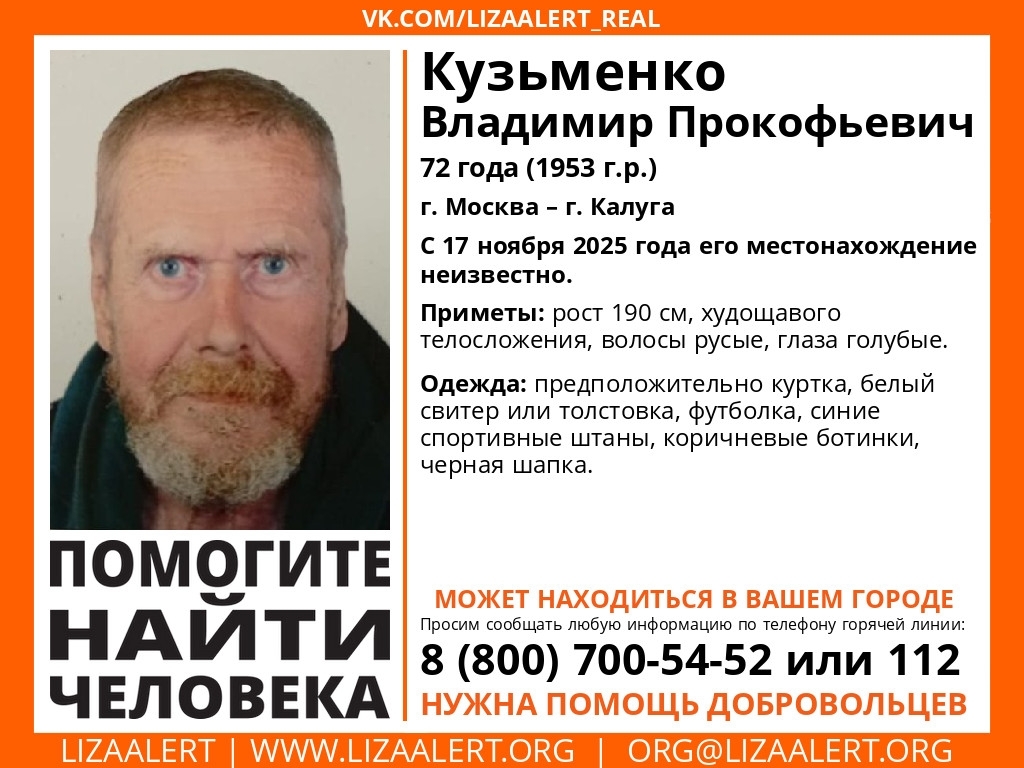 72-летний Владимир Прокофьевич Кузьменко исчез еще 17 ноября. С тех пор его местонахождение неизвестно. О поисках пенсионера объявили в отряде "Лиза Алерт".