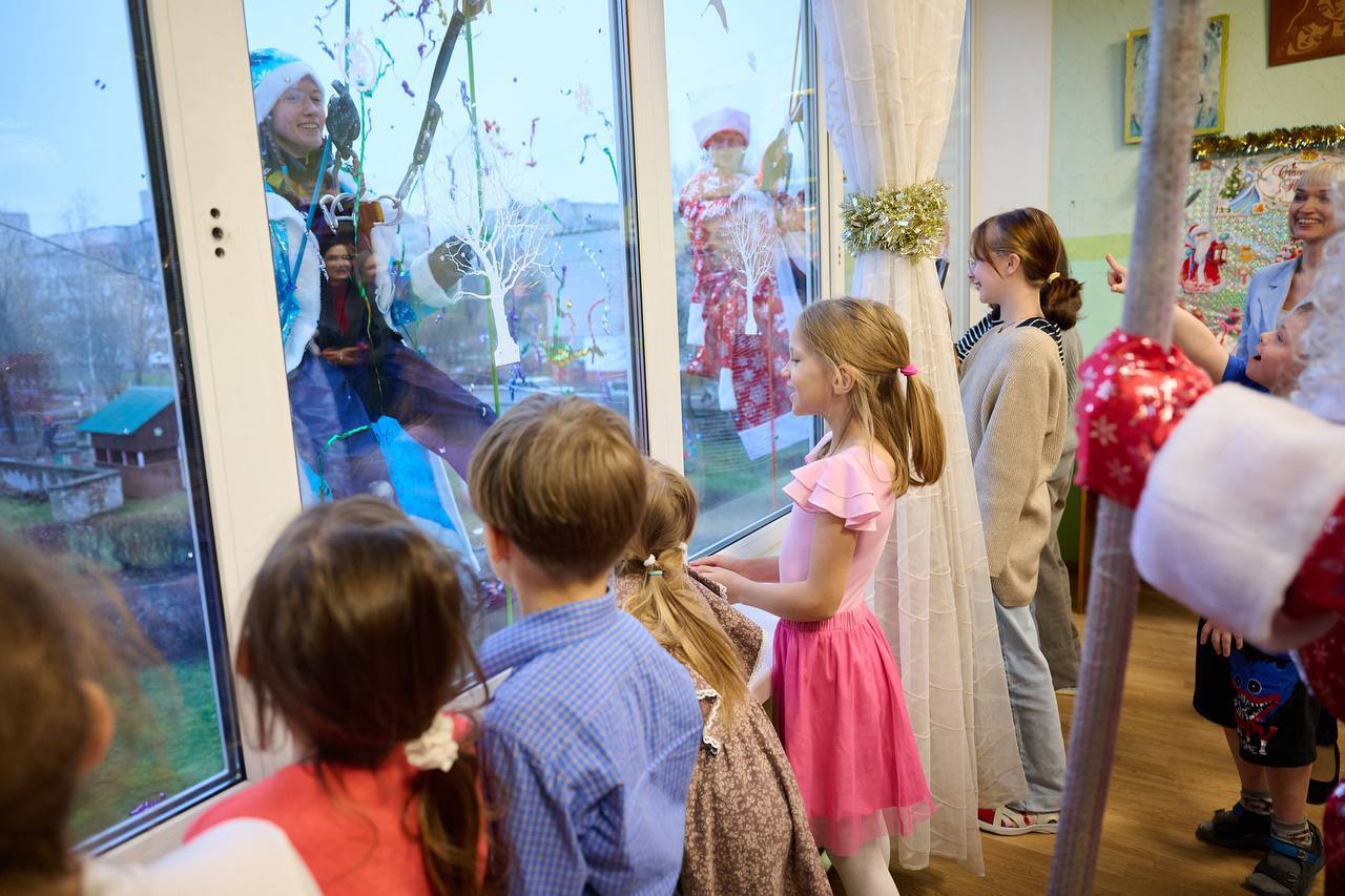 «Воспитанники Обнинского центра социальной помощи семье и детям "Милосердие" с восторгом прильнули к окнам. Когда еще увидишь новогодних волшебников, парящих на высоте нескольких этажей»,