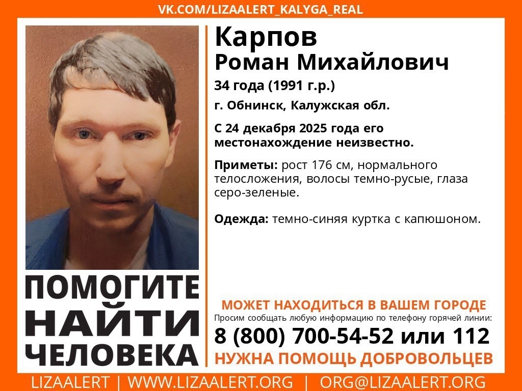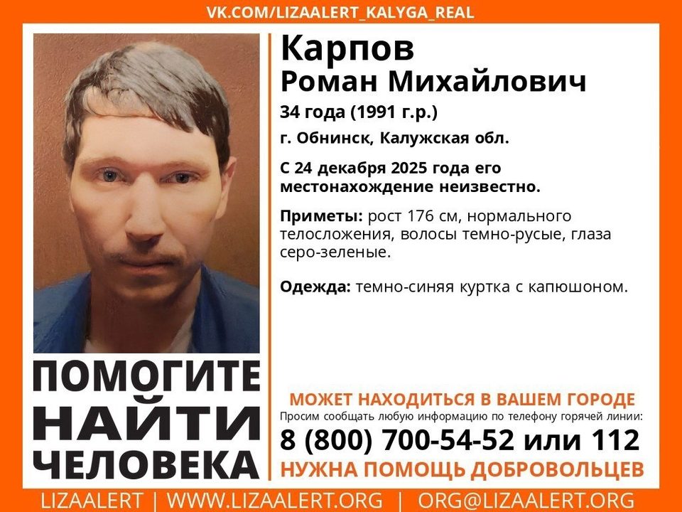 В Обнинске исчез 34-летний Роман Карпов. Его не видели еще с 24 декабря. О поисках мужчины объявили в отряде "Лиза Алерт".