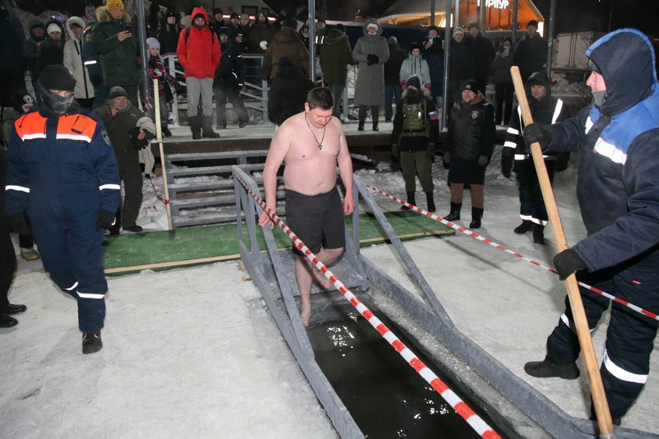 Купания начались в восемь часов вечера после того, как воду в водохранилище освятили. На берегу дежурили полицейские, спасатели и медики. Для купальщиков была построена теплая раздевалка. Их согревали горячим чаем.