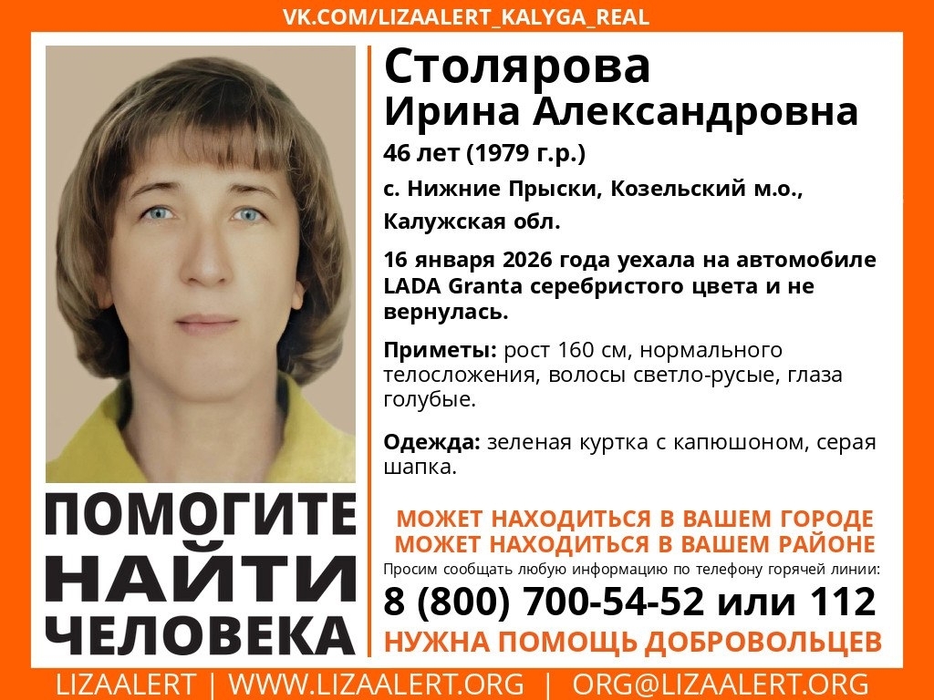 46-летняя Ирина Столярова из села Нижние Прыски Козельского округа исчезла 16 января. Женщина уехала на серебристой Lada Granta и не вернулась.