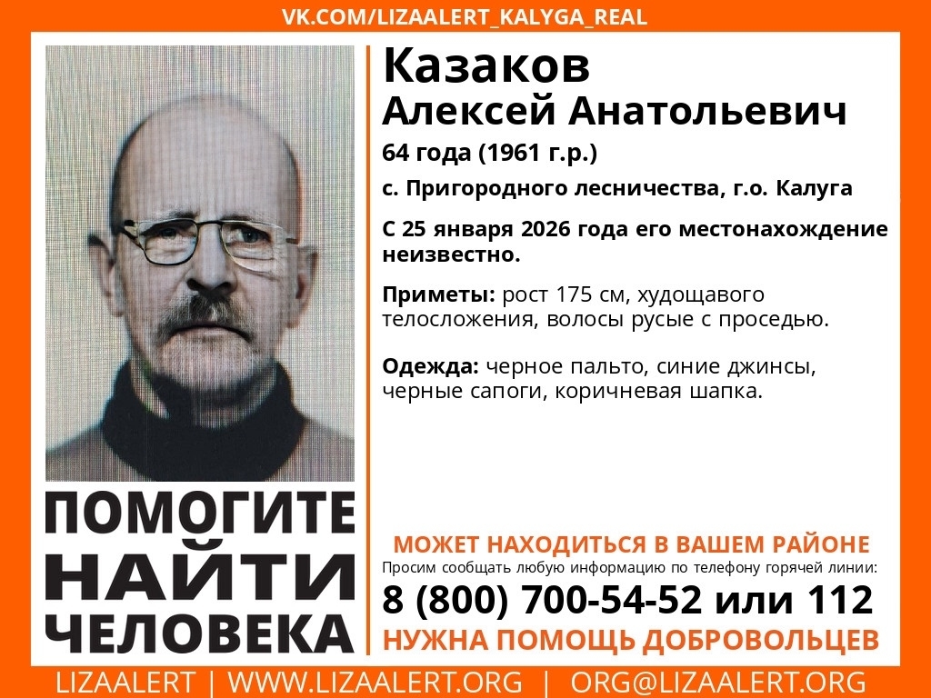 Алексей Анатольевич Казаков исчез 25 января в селе Пригородного лесничества. О пропаже 64-летнего мужчины объявили в поисково-спасательном отряде "Лиза Алерт".